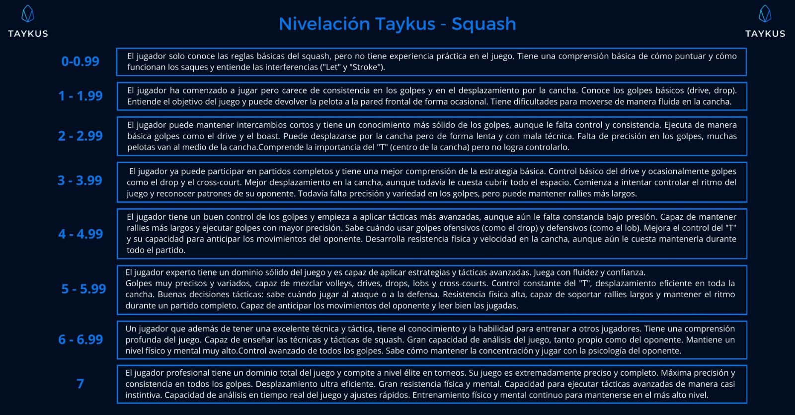 También Taikus dispone de la nueva opción de abrir partidos para encontrar contrincante. ve a la opción partidos de la parte inferior derecha; selecciona deporte , fecha y hora elegida y a continuación busca Match Point Sevilla en el buscador. Marca la opción crear partido y listo. Tienes tu partido creado e incluso puedes madar el enlace por nuestros grupos de whatsapp para que lo vean otros jugadores. Te lo mostramso en este pequeño video. Para poder abrir y apuntarte a estos partidos, Taikus tiene que asignarte un nivel de squash para que los partidos sean más equilibrados, solo los jugadores que esten en tu rango de nivel podrán apuntarse automáticamente. En este video te mostramos con Taikus te asigna tu nivel de squash, según muestra nuestra tabla de nivelación de squash.